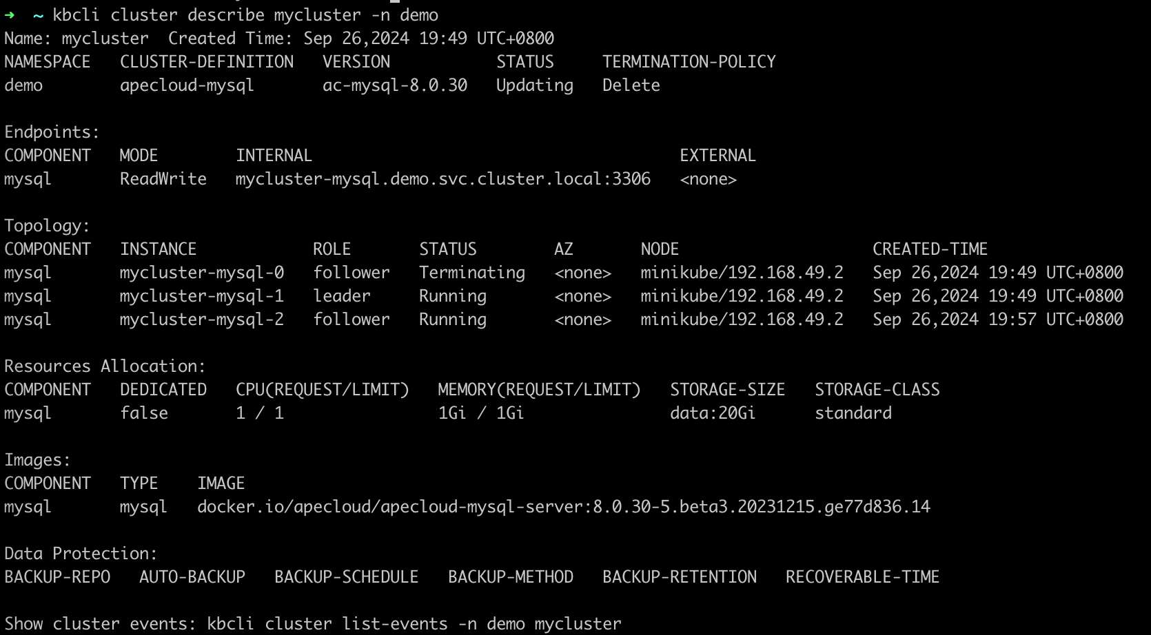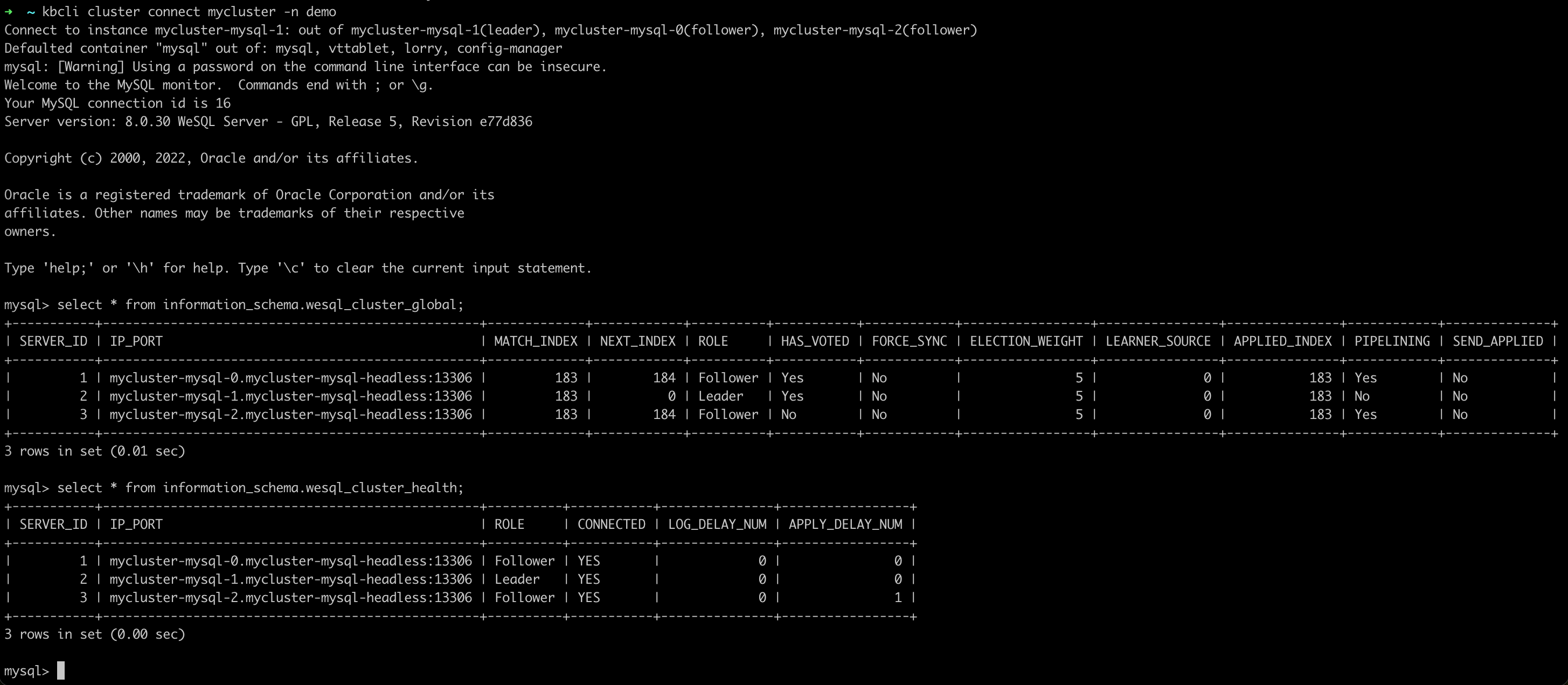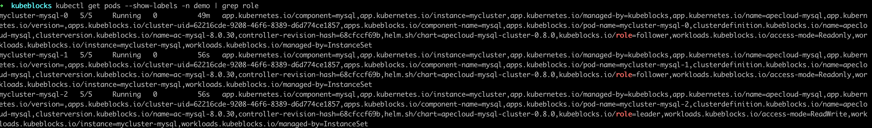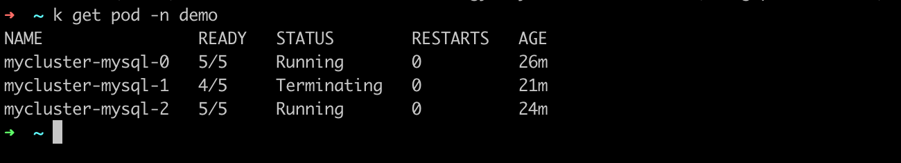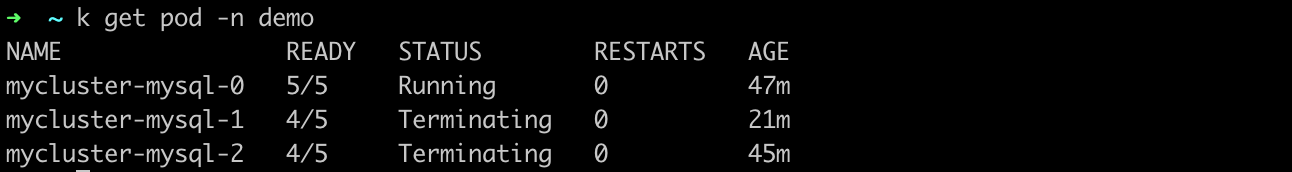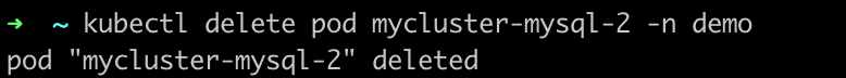 kubectl delete pod mycluster-mysql-1 mycluster-mysql-2 -n demo