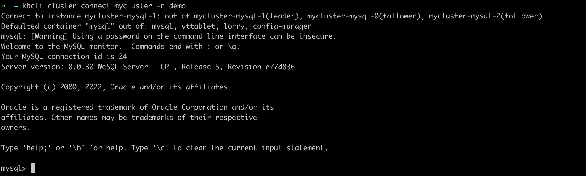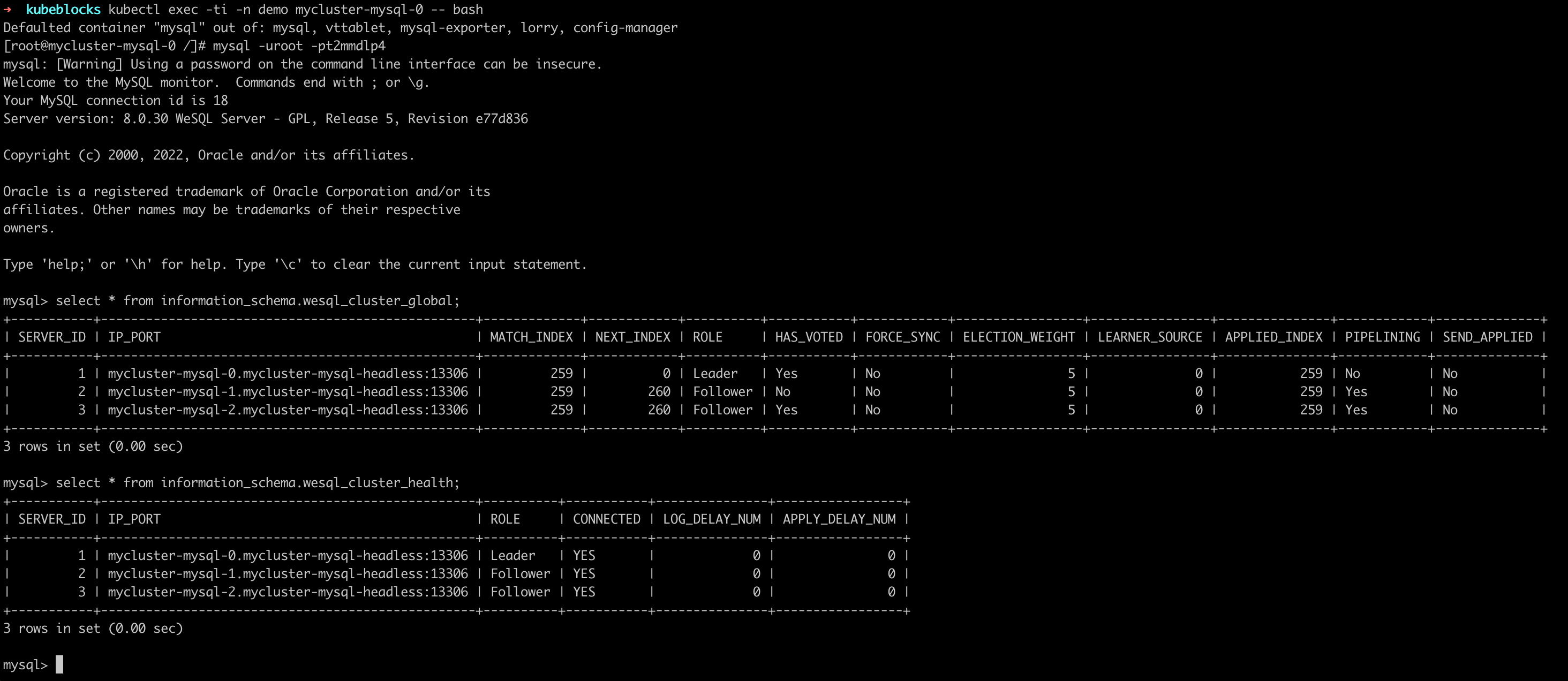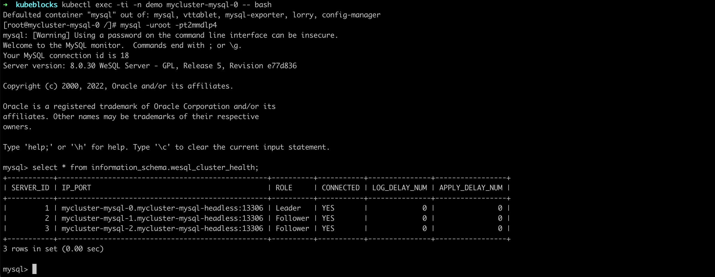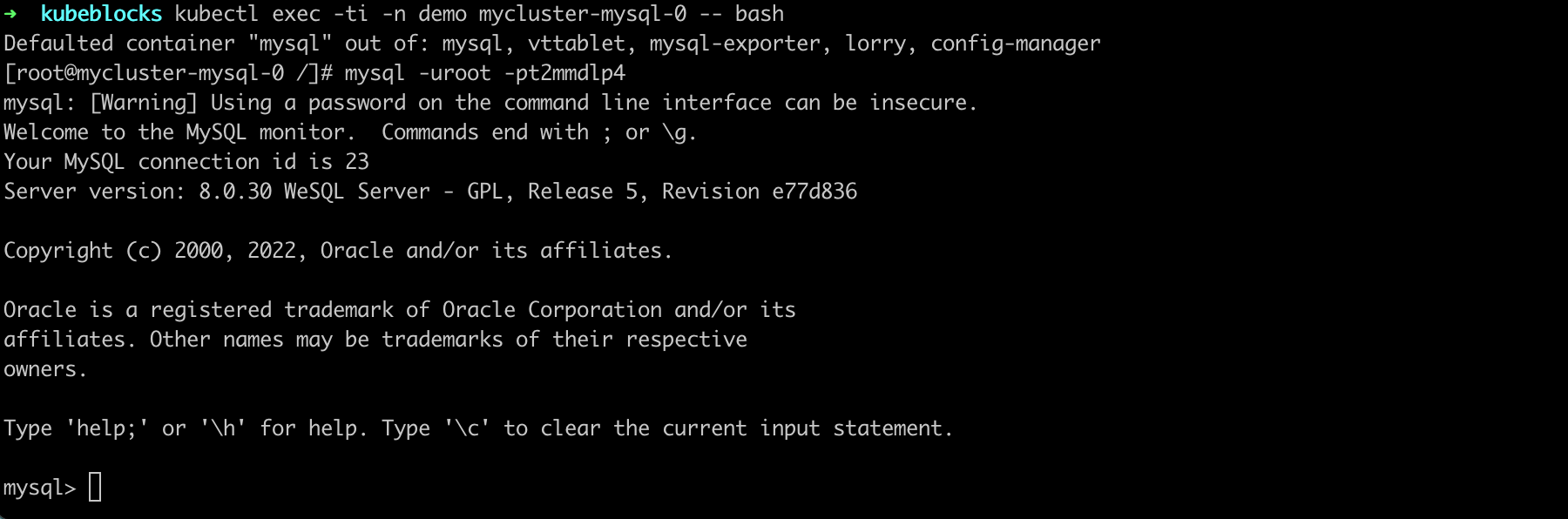 kubectl exec -ti -n demo mycluster-mysql-0 -- bash
