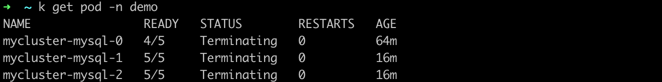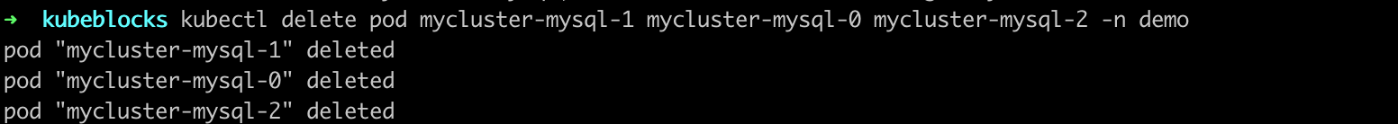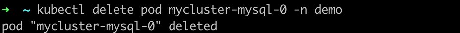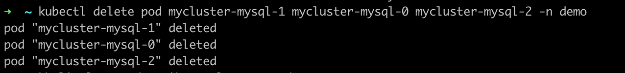 kubectl delete pod mycluster-mysql-1 mycluster-mysql-0 mycluster-mysql-2 -n demo