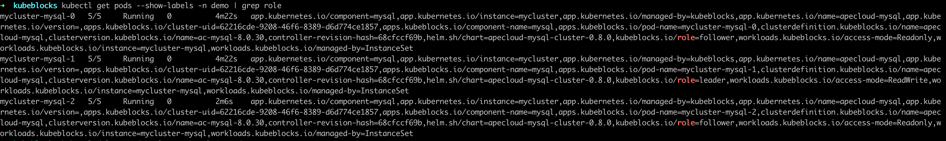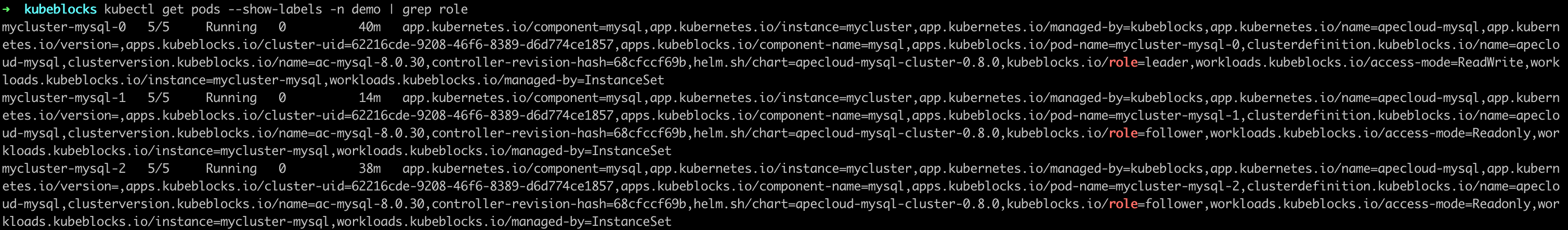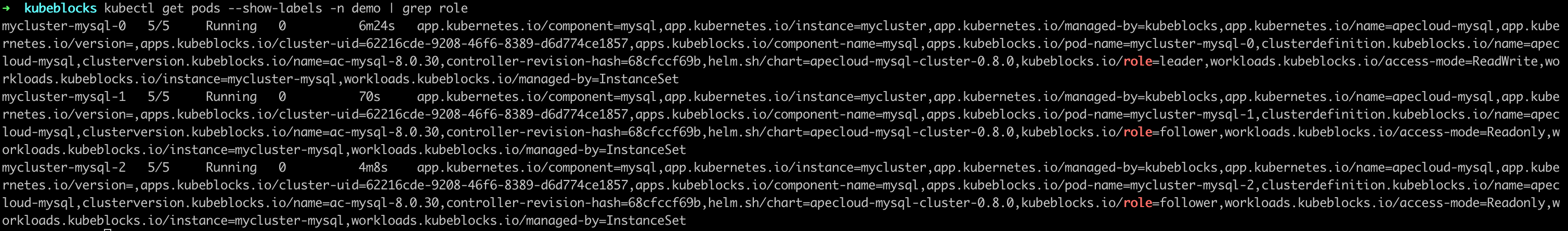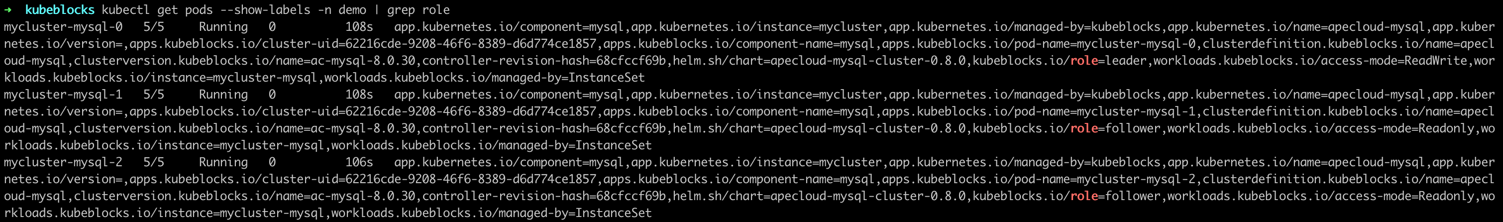 View the pod role again. In this example, the follower pods are mycluster-mysql-1 and mycluster-mysql-2.