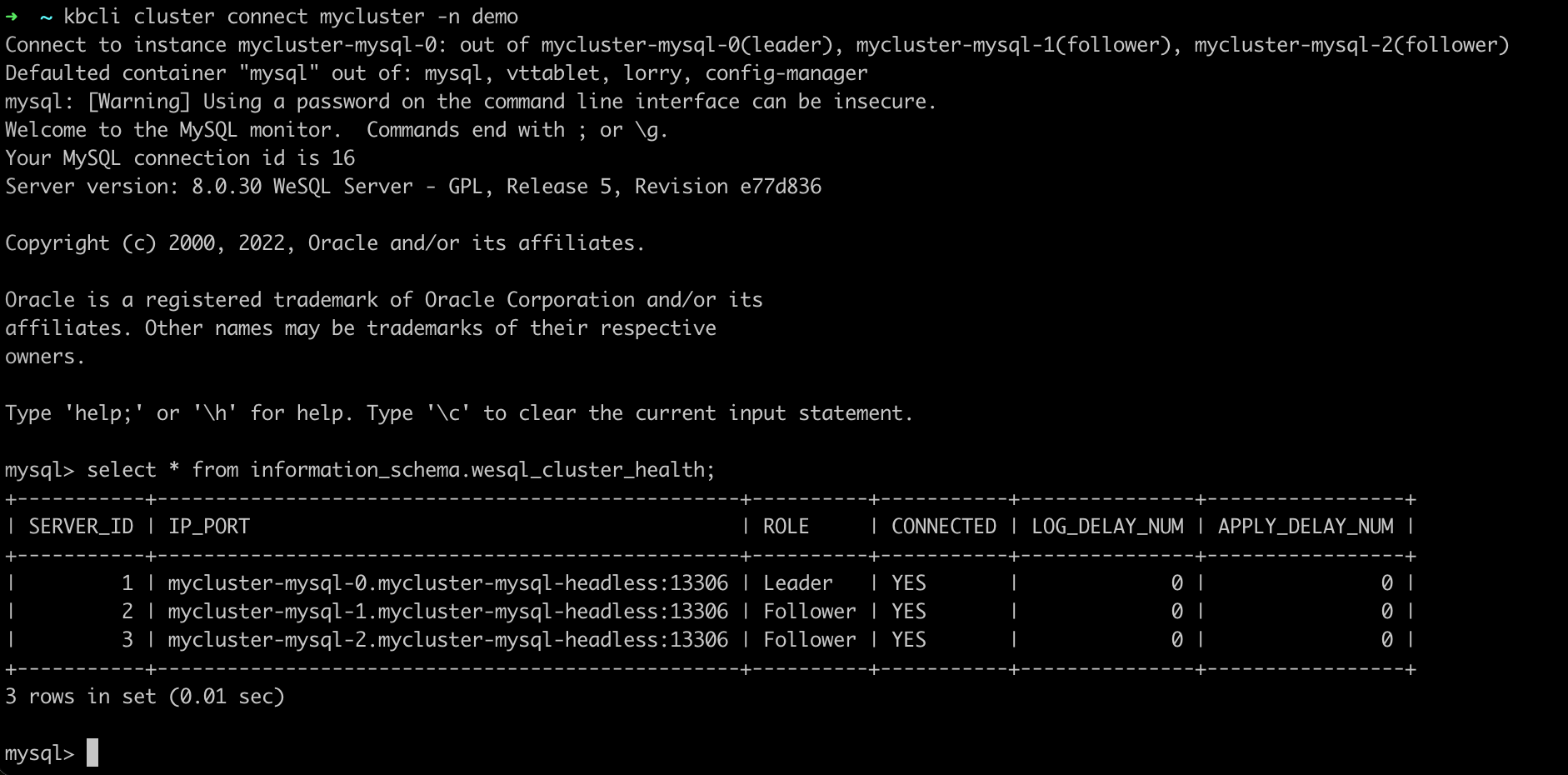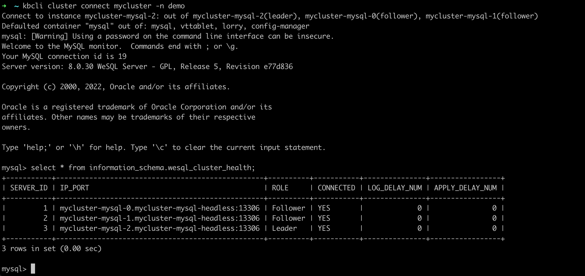 Run kbcli cluster connect mycluster again after a few seconds and you can find the pods in the RaftGroup work normally again.