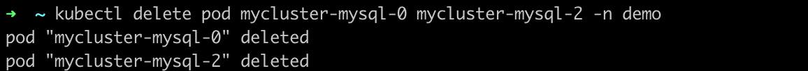 kubectl delete pod mycluster-mysql-0 mycluster-mysql-2 -n demo