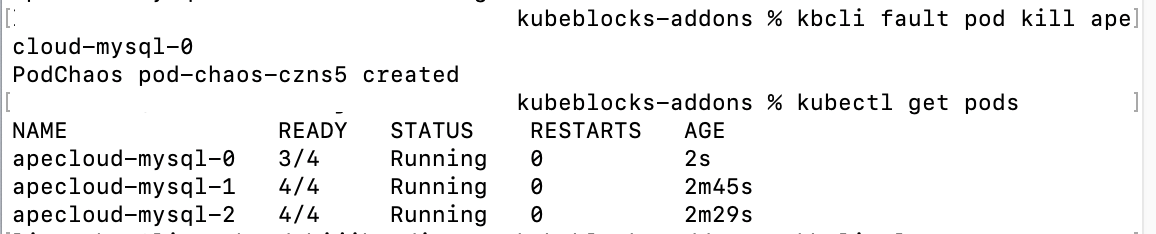 After deleting the Pod apecloud-mysql-0, you can see that it has 3 out of 4 containers ready, with the MySQL container being unavailable.