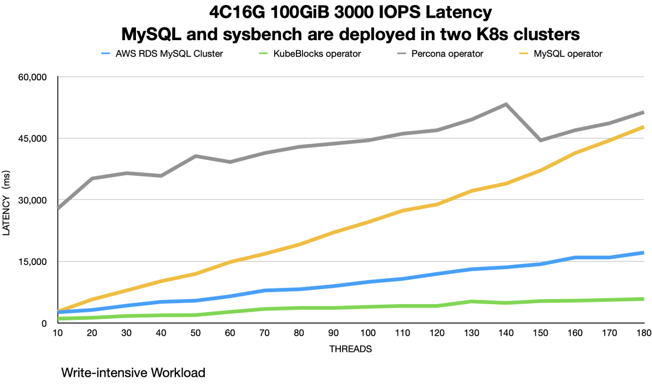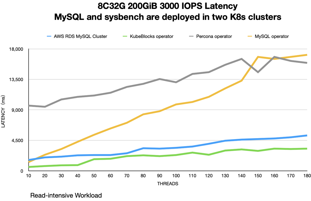 The three workloads chosen in this article all involve a large amount of read and write operations on EBS. By setting innodb_redo_log_capacity to 2G, KubeBlocks has lower RT in IO-bound situations. After adjusting the IOPS to 12000, the RT of AWS RDS MySQL cluster has improved significantly. To achieve better performance, users should purchase enough IOPS. However, it is important to remember that AWS IOPS can be expensive, so more is not necessarily better.