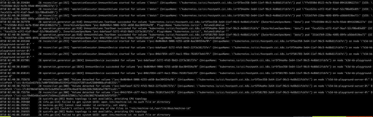 It seems that while the kubelet was attempting to unmount the data volume, it encountered an error because it couldn’t find the corresponding Hostpath CSI Driver. After some checking, we confirmed that the Hostpath CSI Driver had indeed been removed during one of the earlier steps. So, we quickly reinstalled it.