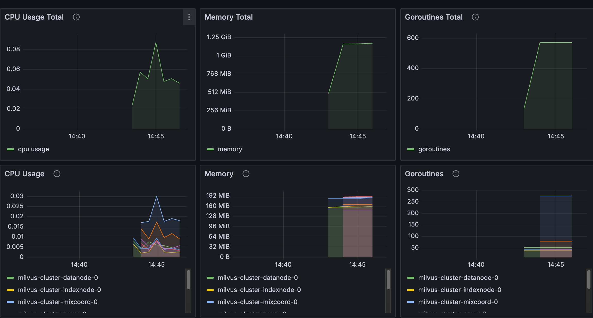 Finally, we visualized these metrics in Grafana. This setup provides valuable insights for monitoring the health and performance of your Milvus databases.