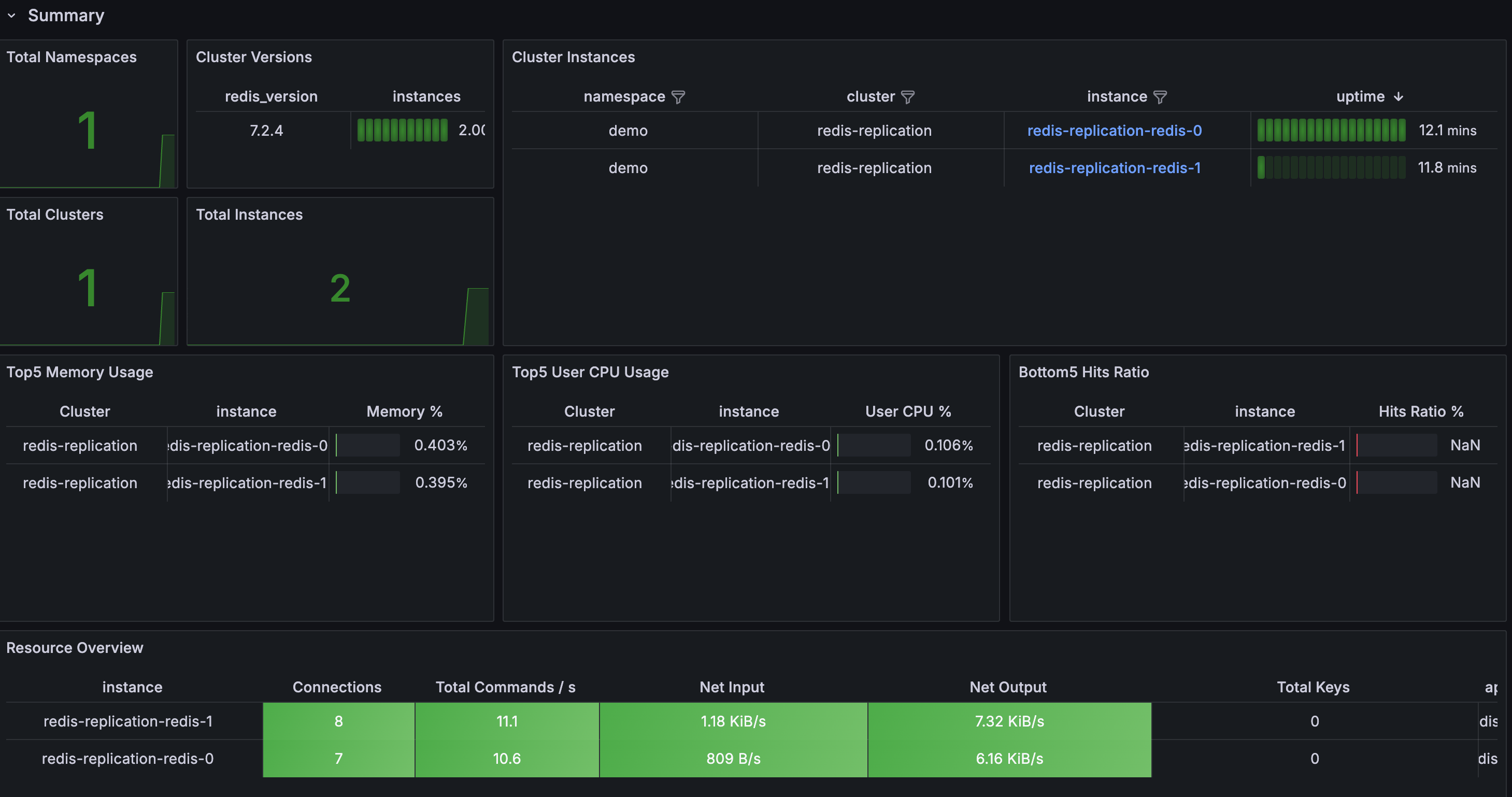 https://raw.githubusercontent.com/apecloud/kubeblocks-addons/main/addons/redis/dashboards/redis.jsonDashboard Includes: